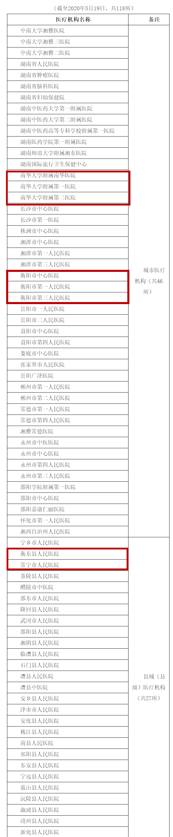 經(jīng)國家衛(wèi)生健康委臨床檢驗(yàn)中心《新冠病毒核酸檢測信息平臺(tái)》查詢,湖南開展新冠病毒核酸檢測的醫(yī)療機(jī)構(gòu)名單5月19日下午公布。其中,衡陽有9家醫(yī)療單位可開展新冠病毒核酸檢測,他們分別是南華大學(xué)附屬第一醫(yī)院、南華大學(xué)附屬第二醫(yī)院、南華大學(xué)附屬南華醫(yī)院、衡陽市中心醫(yī)院、衡陽市第一人民醫(yī)院、衡陽市第三人民醫(yī)院、衡東縣人民醫(yī)院、常寧市人民醫(yī)院、衡陽市疾病預(yù)防控制中心。具體名單如下: