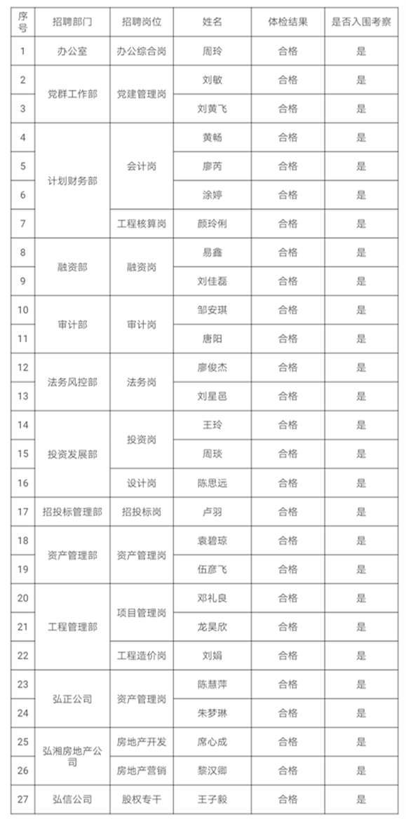 衡陽(yáng)弘湘國(guó)有投資(控股)集團(tuán)有限公司2020年公開(kāi)招聘員工體檢結(jié)果及入圍考察人員公示